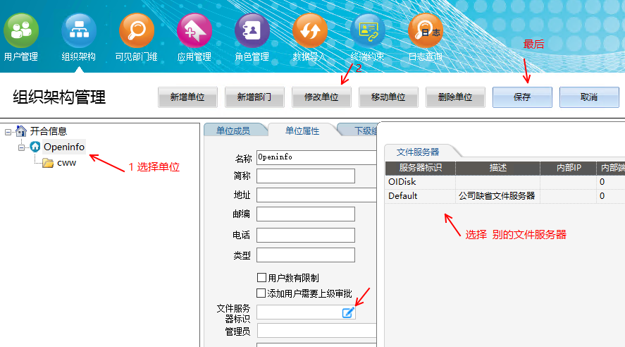 系統(tǒng)設(shè)置默認(rèn)文件服務(wù)器后,一般情況下,所有文件上傳都采用這個(gè)文件服務(wù)器,但也有特殊的需要,比如某一個(gè)單位的,要采用另外的文件服務(wù)器(參考下圖)